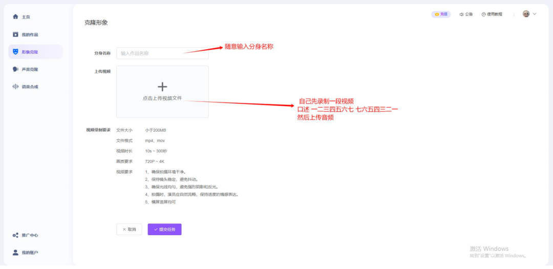 视频需控制在 10 秒内,录制完成后 根据下面步骤即可生成自己的数字人